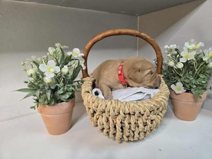 Elle apprécie également les moments de repos douillets et se montre calme à la maison. Son pelage est d'un magnifique jaune Redfox.